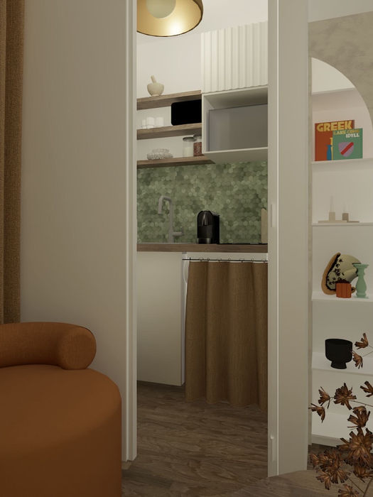 Côté cuisine, nous avons pu rajouter du rangement et la rafraîchir grâce à des adhésifs, que ce soit pour le zellige mosaïque ou pour le plan de travail.